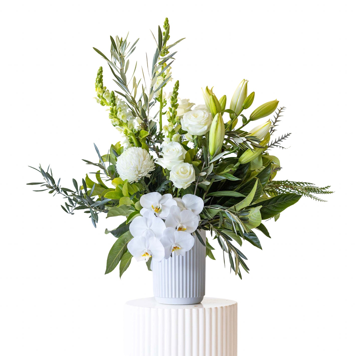 - Signature bouquets – especially our classic white and green arrangements, a favourite for business gifting