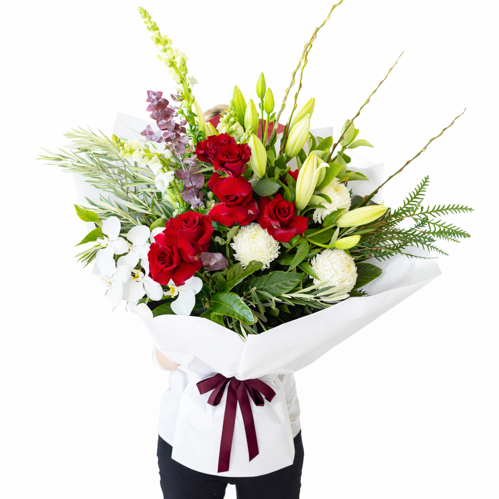 💐 A Romantic Blend of Blooms – Expertly arranged with seasonal favourites that may include lush red roses, elegant lilies, vibrant snapdragons, and delicate disbuds, all paired with fresh foliage such as magnolia and olive for timeless beauty.