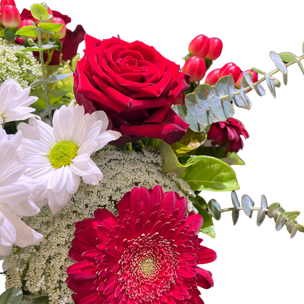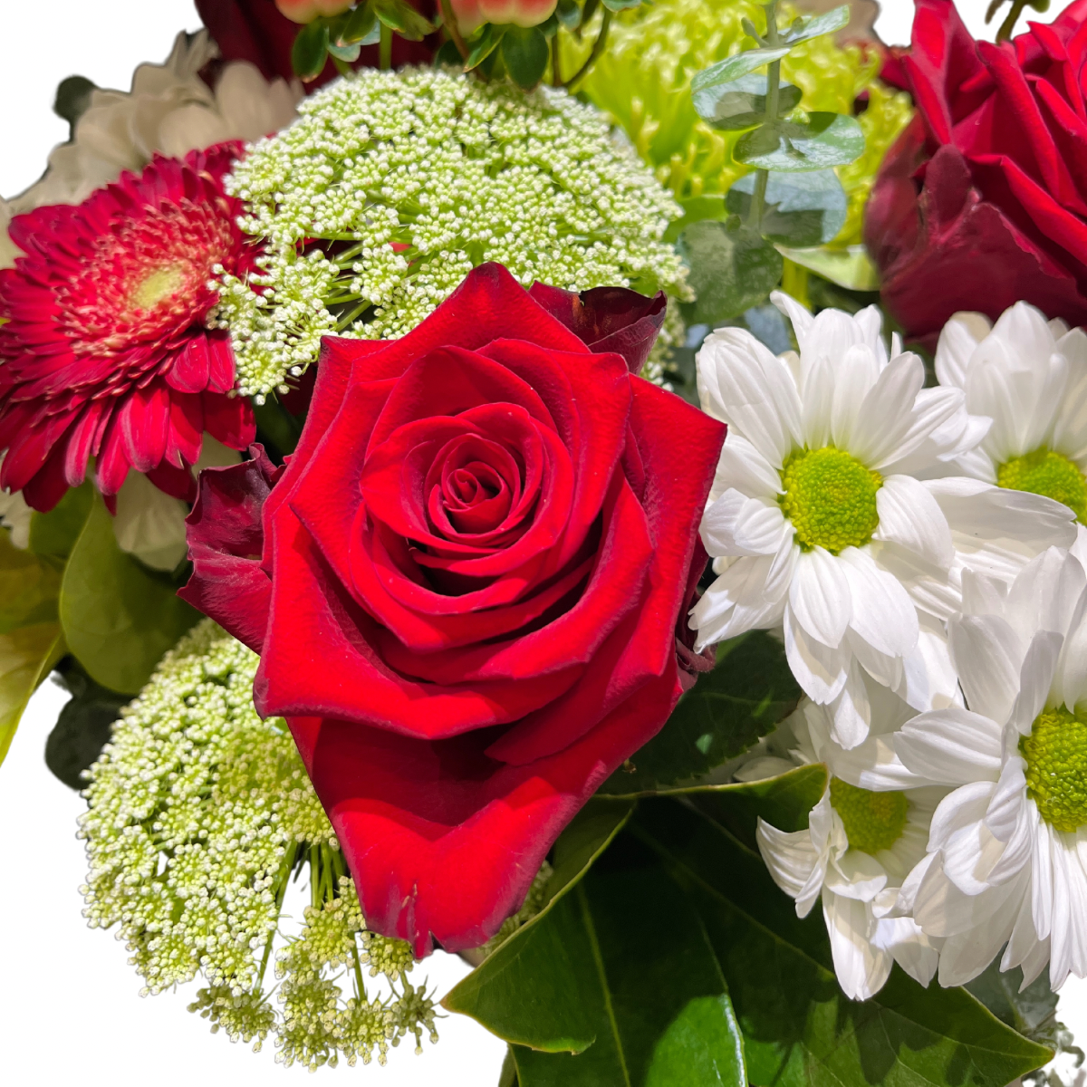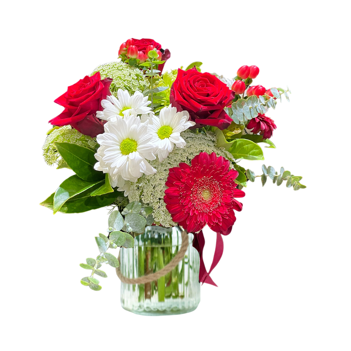 Spread holiday joy with the Jingle Bells Posy, featuring a festive mix of red and white flowers paired with fresh green foliage. Perfect for Christmas gifting, table decor, or as a cheerful addition to your home, this posy is beautifully arranged in a reusable glass jar vase, making it a practical and eco-friendly choice.