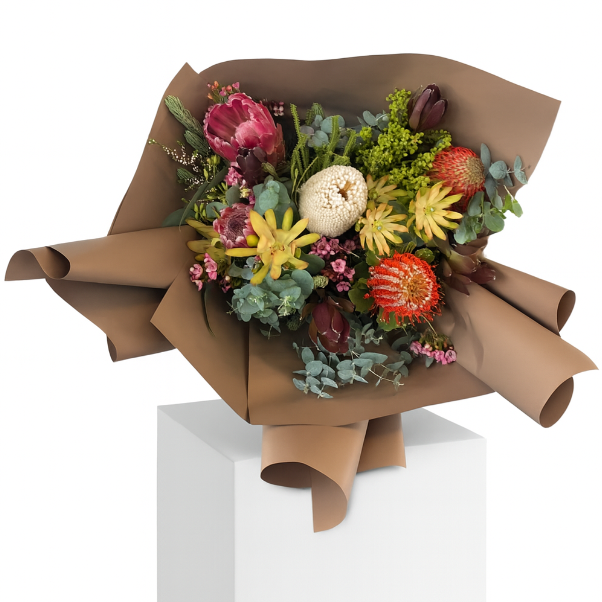 Whimsical Wildflowers is a stunning medley of handpicked seasonal native flowers, expertly arranged to showcase the untamed charm of Australia's flora, making it a delightful surprise for any occasion.